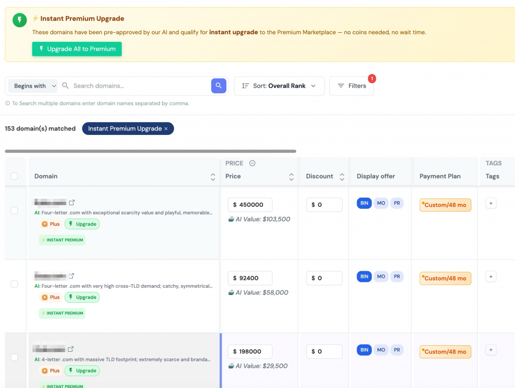 When you add a domain, we will run a real-time assessment and highlight which ones qualify for immediate premium approval.