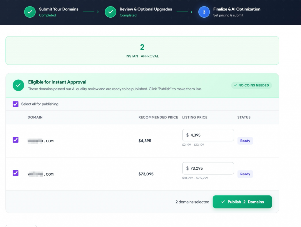 If your domain meets our standards, you will see the option to list it immediately. No submissions, no waiting, no coins. It goes live in the Premium Marketplace immediately.