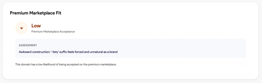 You can enter any domain and get an instant read on whether it qualifies for the premium along with an analysis of its strengths and comparable sales. If it qualifies, you can list immediately.