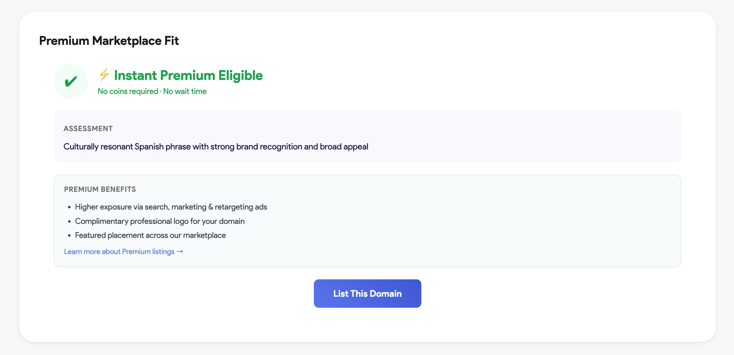 You can enter any domain and get an instant read on whether it qualifies for the premium along with an analysis of its strengths and comparable sales. If it qualifies, you can list immediately.