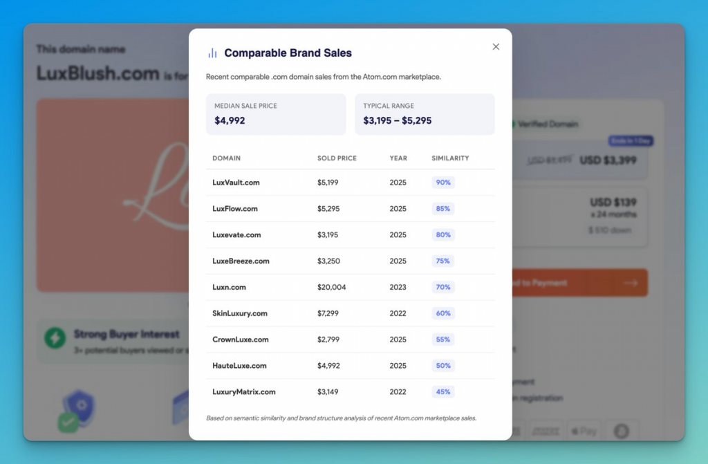 With this new feature, buyers can click. Comparative sales Directly from the domain landing page to see a small set of similar domains previously sold on the Atom Marketplace in Compare Price range.
